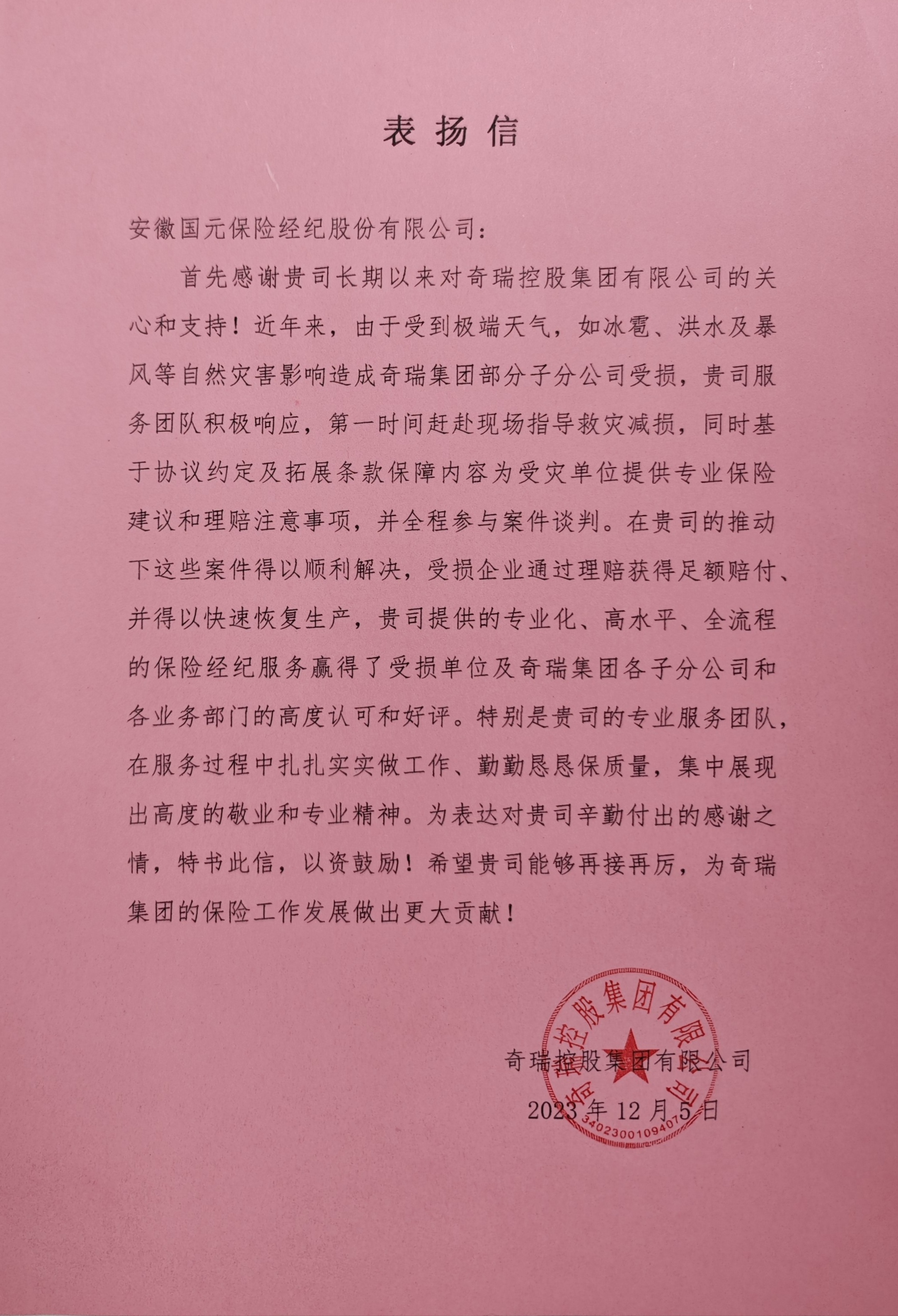 奇瑞集團在表揚信中特別提到,國元保險經(jīng)紀在服務過程中扎實工作,勤勉盡責,展現(xiàn)出高度的敬業(yè)和專業(yè)精神,贏得了受損單位、奇瑞集團各子分公司及各業(yè)務部門的高度認可和好評。